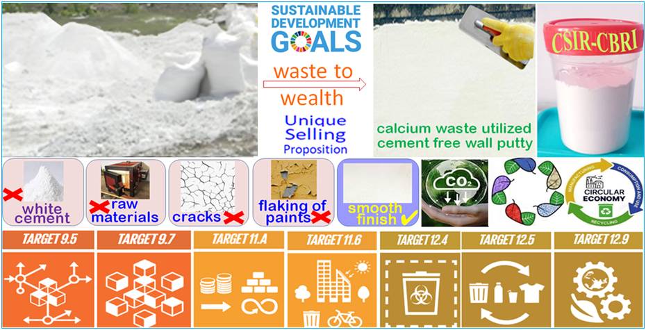 | Value Proposition: | Commercially available wall putty (JK, Nerolac, Asian Paints etc) is based upon the white cement and natural resources dolomite with some polymer materials. Developed putty product is based upon the calcium industrial waste by-product derived from the industries without any additional white cement. It having wide spread wall finishing applications on cemented wall plaster surface, to make the plaster surface smooth so that surface require less paint/distemper and glossy finish.