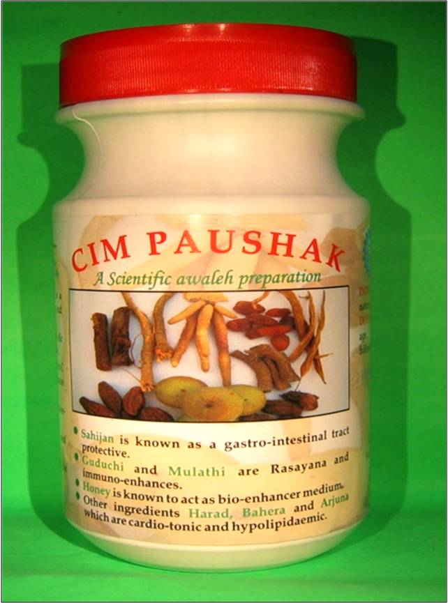 | Summary Application: | CIM Paushak, developed by CSIR-CIMAP, is a Chyawanprash-like formulation. It is a standardized and scientifically-validated Awleha (thick paste) preparation that strengthens the immune system and contains various nutrients. CIM Paushak is a unique amalgamation of traditional knowledge (Rasayana concept) and modern science. It is safe and effective formulation containing 12 well known powerful Ayurveda herbs (ingredients) such as Vitis vinifera, Boerhavia diffusa, Moringa oleifera, Withania somnifera, Sida cordifolia, Glycyrrhiza glabra, Terminalia chebula, Asparagus racemosus, Tinospora cordifolia, Terminalia bellerica, Terminalia arjuna with Emblica officinalis (Amla) as the base. |