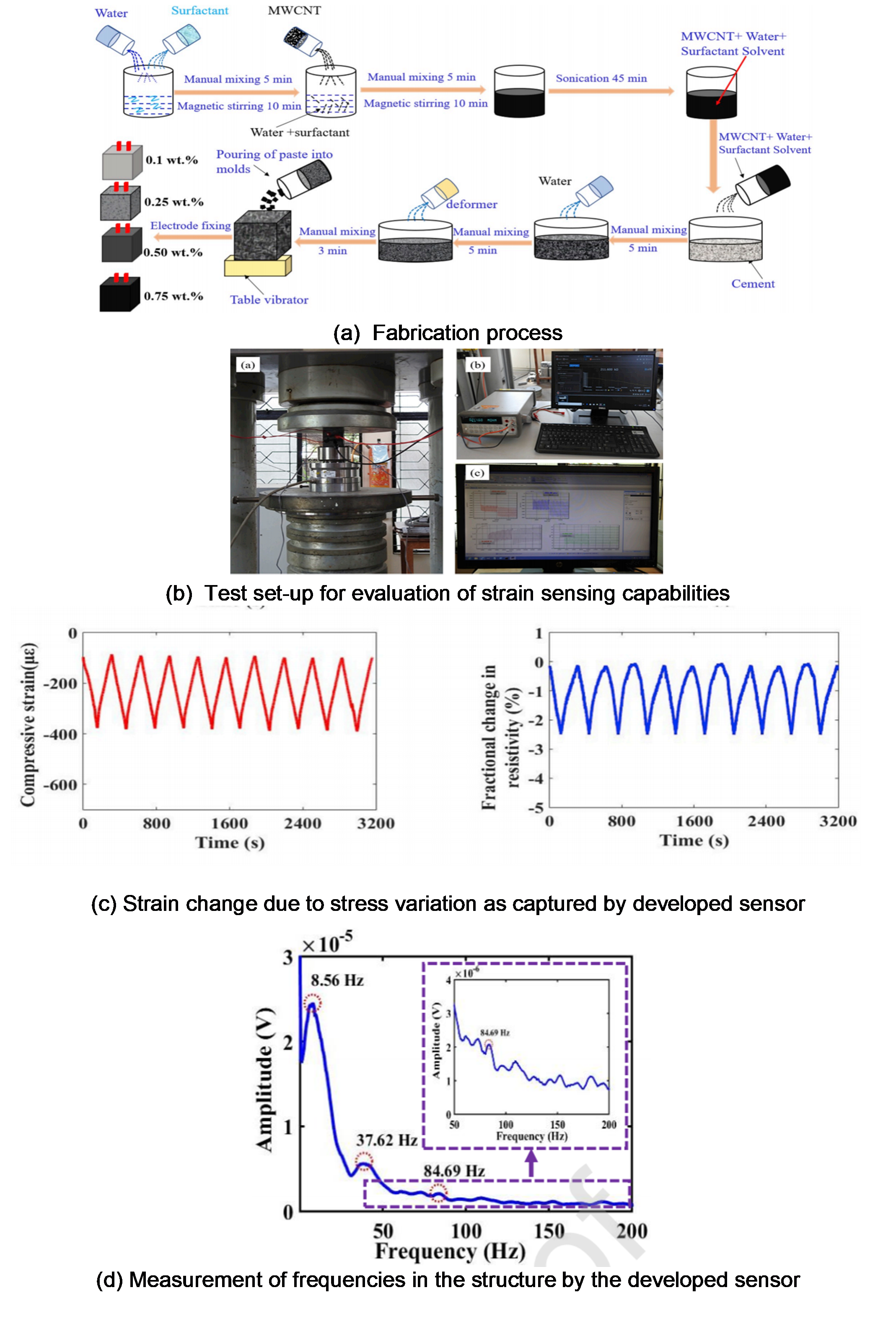 | Advantages: | The developed CNC sensors have very high potential for their use as embedded sensors. It paves the new path for using the CNC sensors for dual strain- and vibration-based continuous health monitoring and assessment of structures. The large concrete structures (specially critical structures susceptible to mechanical and environmental degradation) will be easy monitored using these sensors where the sensors can be embedded in the structure for long term monitoring. Due to effectiveness, nominal cost and robustness, the sensors will be a game-changer in the domain of health monitoring of civil (prestressed and reinforced concrete) structures. |