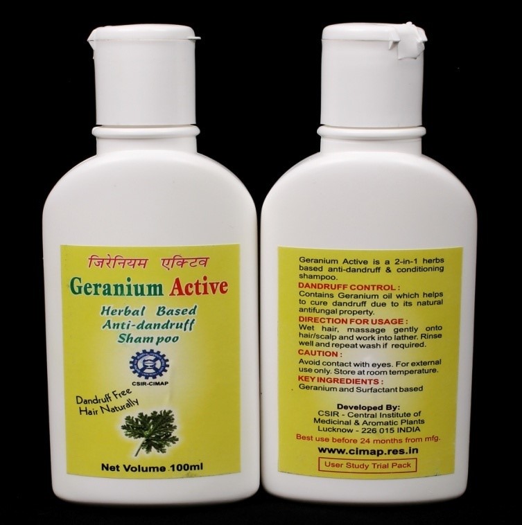 | Summary Application: | The herbal formulation named Geranium Active is a unique blend of herbal extracts with natural essential oilis, removes fungal infection that causes dandruff. |