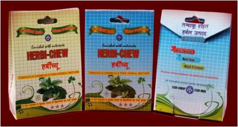 | Summary Application: | The herbal formulation named HERBI CHEW is a Tobacco & chemical free herbal mouth freshener having Herbs, Menthol, Arecanut with binder, useful in individuals of all age groups, especially those addicted to chewing gutkha, pan masala or similar products. |