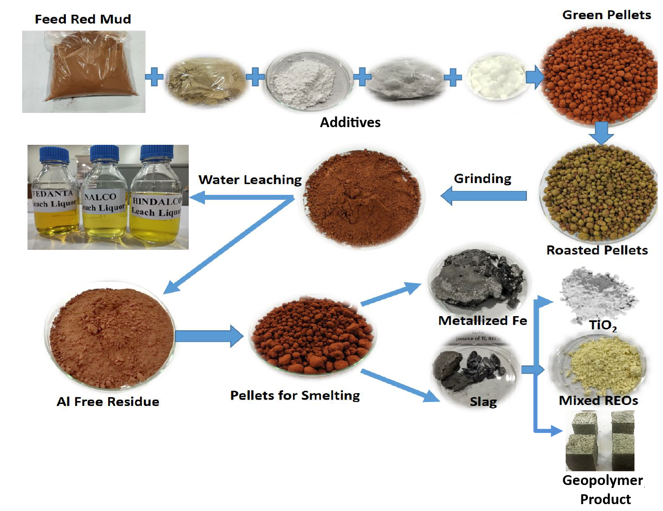 | Value Proposition: | >85-99% recovery of Alumina, Iron, Rare earth oxides (REOs) and Titania from red mud. For generic value, an estimate of 100kg of red mud upon processing by this technology generates 10.5 kg Alumina, 35.8 kg pig iron, 42 gram of REOs, 2.15kg TiO2 and 16.7kg geo-polymeric products . |