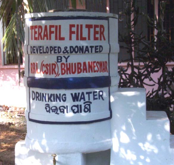 | Summary Application: | Terafil red clay is a low cost and sustainable water purification media (disc/candle) for efficient treatment and filtration of turbid and high iron containing drinking water. Pores in the Terafil disc are separated from one another by a ultrafine sintered clay membrane, but are connected through capillaries in the clay membranes whose openings are within 200 nm diameter; much smaller than iron colloids, turbid particles and most of the pathogens. Complete removal of iron and suspended particles from water is achieved along with significant removal of pathogens through this medium without clogging its core. The architecture of the disc (prepared by sintering a mixture of sand, red clay and wood saw dust) ensures a high rate of filtration and long operational life of 3-5yrs. Quality of filtered water falls within BIS limits, especially for turbidity and iron. Average rate of filtration is 13ml/hr per unit area (cm2) with input water having 50 NTU turbidity and 250mm water head. Fitted with food grade plastic or stainless steel containers it serves a point of use water filter for domestic purpose (50 litre/day). A battery of discs can be fitted to water tanks for community usage (1000-100,000 litre/day). |
