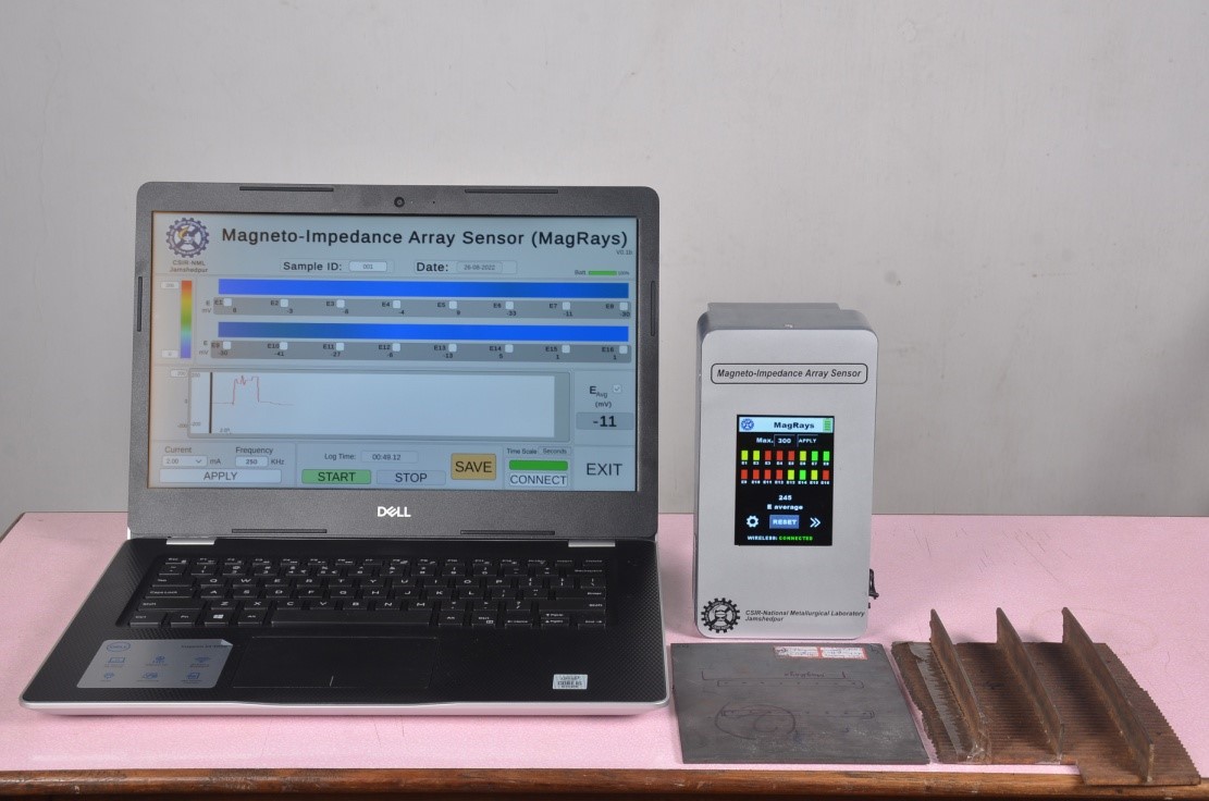 | Summary Application: | The earlier developed Giant Magneto-impedance (GMI) sensor has only a single sensor element, which is a rapidly quenched amorphous microwire of a diameter in the range of 80 to 120 microns. Therefore, the area of assessment was small. Thus, to increase the coverage area of evaluation, a project was proposed to develop a Giant Magneto-impedance based array sensor for the detection of carburization in austenitic steels/components used in petrochemical refinery units. Based on CSIR-NML’s laboratory experimentation and technical inputs, a device was fabricated by M/s. Acceler Microsystems, Chandigarh. Display and data logging include: