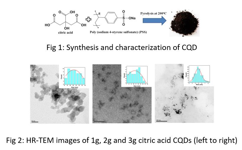 | Advantages: | The CQD's were normally synthesized through supercritical reactor process of organic salt of single carbon source, Citric Acid (CA) with the surface modifier polymer Poly sodium 4-styrene sulfonate (PSS). Attachment of PSS on CQD surface makes PSS-CQD powder easily dispersible in aqueous suspension. The citric acid served as the carbon source, while PSS provided stabilization, dispersion in water and control over the particle size. Carbon Quantum Dots are proven as nontoxic and very much environmental friendly the toxicity test was done at IAS-PSG college, Coimbatore, and found as nontoxic. |