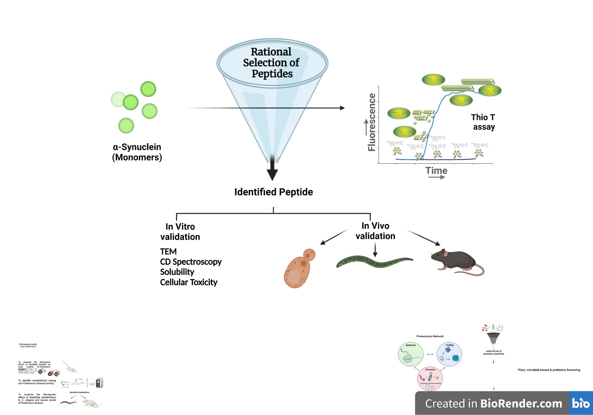 | Summary Application: | Parkinson's disease (PD) is the second most prevalent neurodegenerative disease after Alzheimer's disease. Though multifactorial, the accumulation of α-synuclein amyloid aggregates, known as Lewy bodies, in dopaminergic cells of the substantia nigra region of the brain is a characteristic cellular hallmark of PD. The condition predominantly affects muscle movements, manifesting first with difficulties in chewing and swallowing, drooling, and constipation. The disease progresses with common motor symptoms such as difficulties in movement, tremor, rigidity and posture, etc. As of now, only symptomatic relief is available, and there is no cure. The group recently screened various peptide-based molecules and identified a potent peptide that reduced α-synuclein amyloid aggregation in both in vitro and in vivo models of PD. |