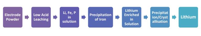 | Summary Application: | With acid leaching using 10-20% solids, 98-100% Li, Fe and P could be extracted. The leach liquor was subjected to a selective sequential precipitation route to extract 90-95%% pure lithium as lithium carbonate/lithium hydroxide and 98% pure iron phosphate. Purified graphite was a derivative in the process.
