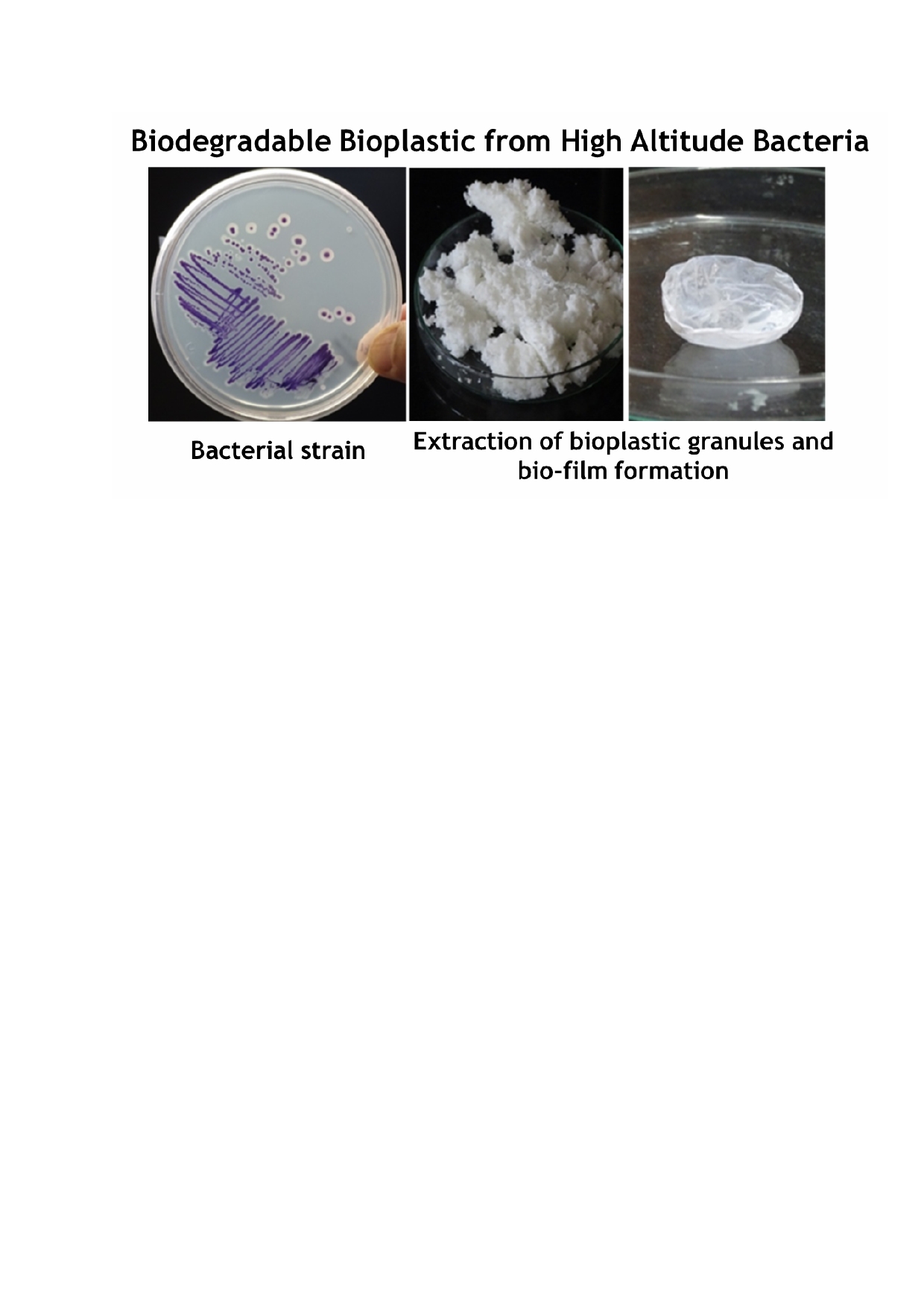 | Summary Application: | Considering the importance of the bioplastics, CSIR-IHBT has identified a unique Himalayan bacterium isolate PCH194 capable of synthesizing PHAs up to 70% of its dry cell weight. In addition, the bacterium simultaneously produces pigment violacein that finds application in textile, cosmetics and pharma industries. Violacein has been attributed with antioxidant, antitumoural, antibacterial, antiviral, and antiprotozoal activities. |