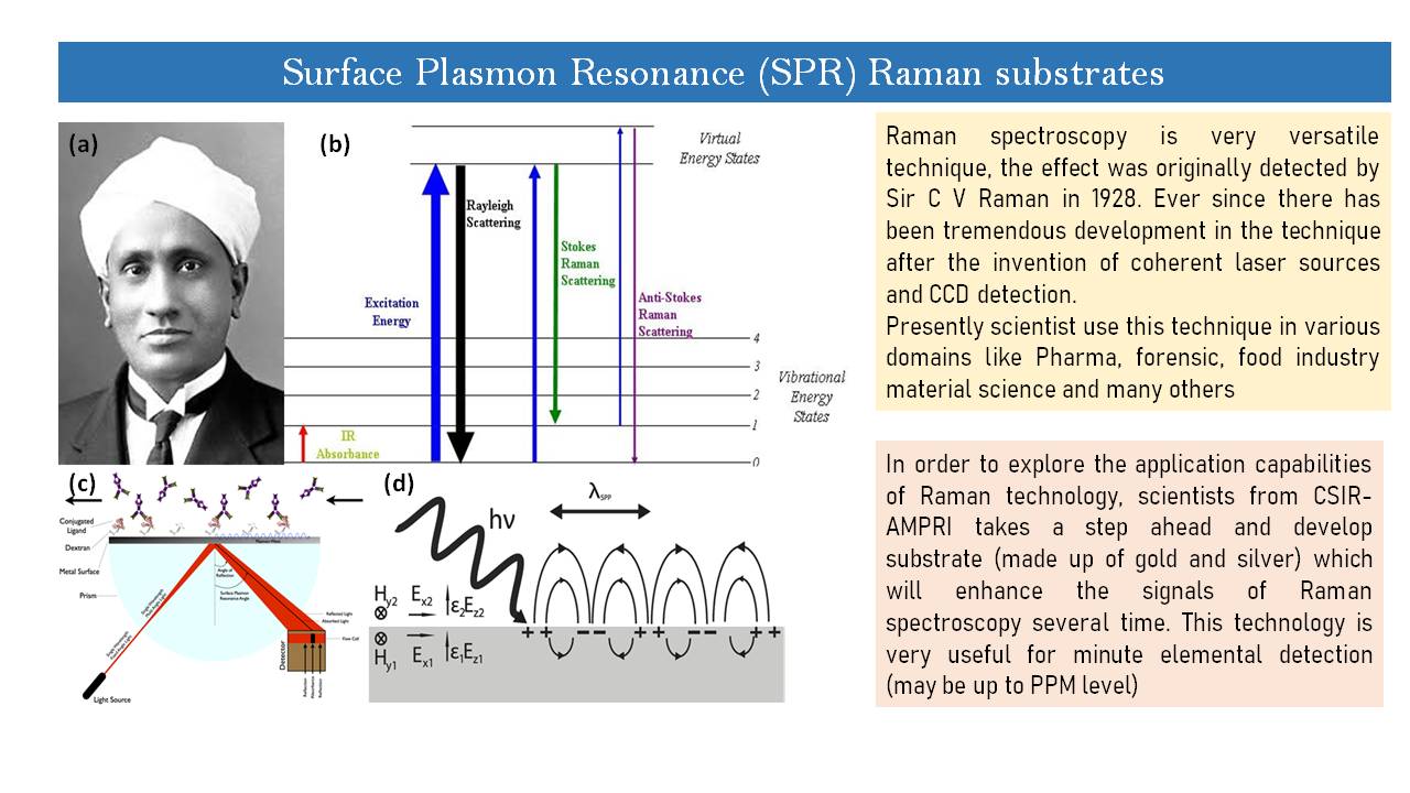 | Summary Application: | RAMAN Spectroscopy and the prospects of the developed know-how in the identification of single molecules with application in pollution control, food security, medicine, biotechnology and pharmaceutical industry and others. The developed knowhow can help solve the modern-day problems of contamination and adulteration of food, medicines, water and other vital human needs. Raman spectroscopy is a very versatile technique; Sir C V Raman originally detected the effect in 1928. Even though the Raman effect was invented in India, there has been very less technology development in spectrometers or lasers. Raman spectroscopy can help to solve many of the modern-day problem faced by Indian society. One step in this direction is this know-how CSIR-AMPRI have developed, which is a unique approach for making Raman substrates which utilize the localised surface plasmon to enhance the Raman signal several-fold in commodity Raman spectrometers. These techniques have wide application in pharmaceutical industries for detecting contamination in medicines or fake medicines, detecting adulteration and contaminants in food & water, forensic etc. |
