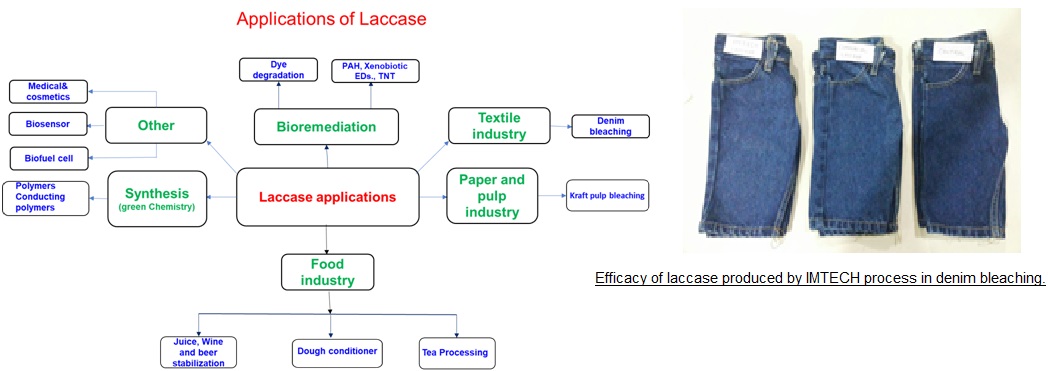 | Advantages: | Laccase (EC 1.10.3.1) has broad enzyme specificity that imparts high application potential for its applications in various fields such as bioremediation, textile, pulp and paper , food and beverage, cosmetics and organic synthesis. Laccase production is difficult as it is produced in the idiophase when cell metabolism is slow. Low intrinsic production and long fermentation cycle increase laccase production cost. The CSIR-IMTECH process has addressed some issues in the production of laccase and using a novel strain, a reliable process for the production of high redox potential laccase has been developed. The laccase has been tested in industrial environment and has been found to give good performance in denim bleaching. Applications: